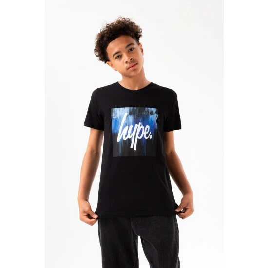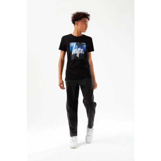 Make a statement in the HYPE. Boys Black Blue Drips Box Script T-Shirt. Designed in our standard kids tee shape with a 100% black cotton fabric base for the ultimate comfort. Featuring a square blue and black drips print, boasting the iconic HYPE. script logo in contrasting white, and finished with a crew neckline and short sleeves. Wear with jeans and a jacket for a casual-smart fit or matching joggers for a more casual look. Machine wash at 30 degrees.