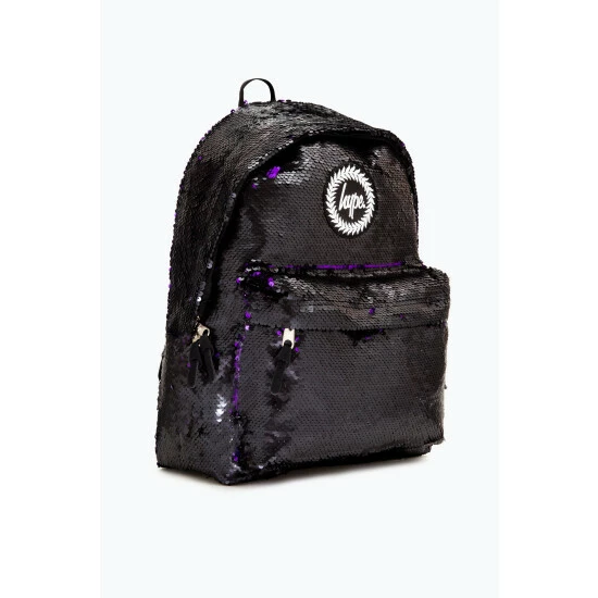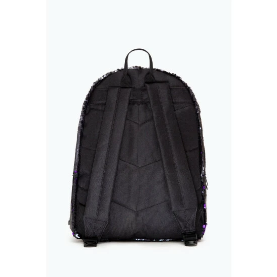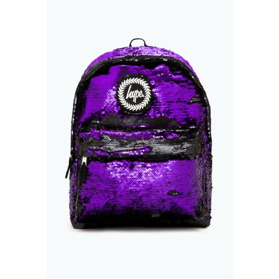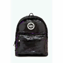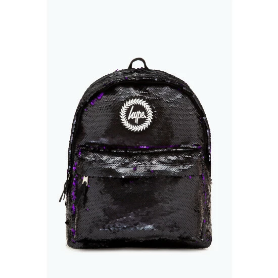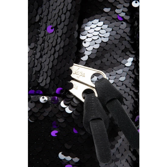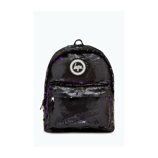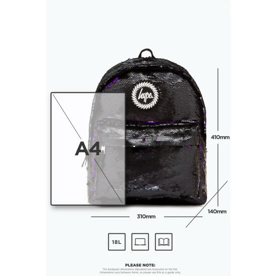 Add a little glitz and glamour to your everyday activities with the Hype. Midnight sequin backpack. Designed in their standard unisex backpack shape and style features a reversible sequin fabric, one stroke is a deep purple and the other is an essential black. Measuring at 42 x 30 x 12cms, this is the perfect size to transport your goods from A to B. Finished with a front mini pocket, grab handle, embossed zips, branded inside lining and the iconic Hype. crest badge in monochrome on the front. The straps offer supreme comfort with just the right amount of padding. Wipe clean only.