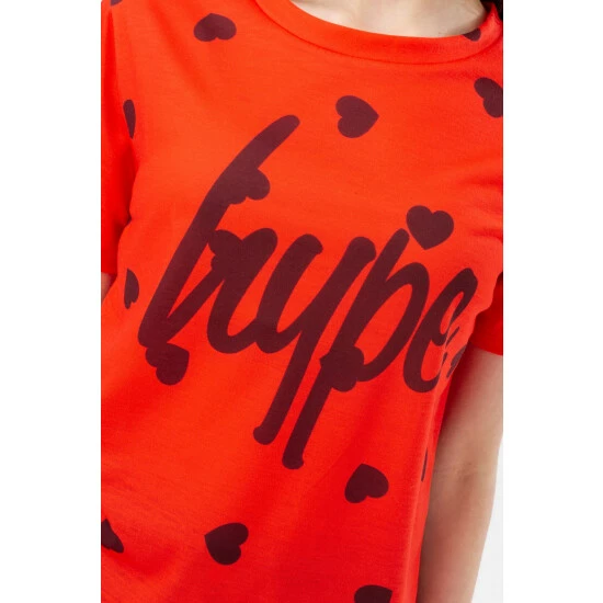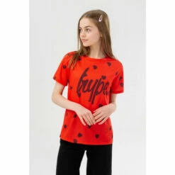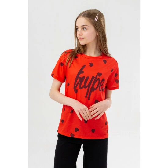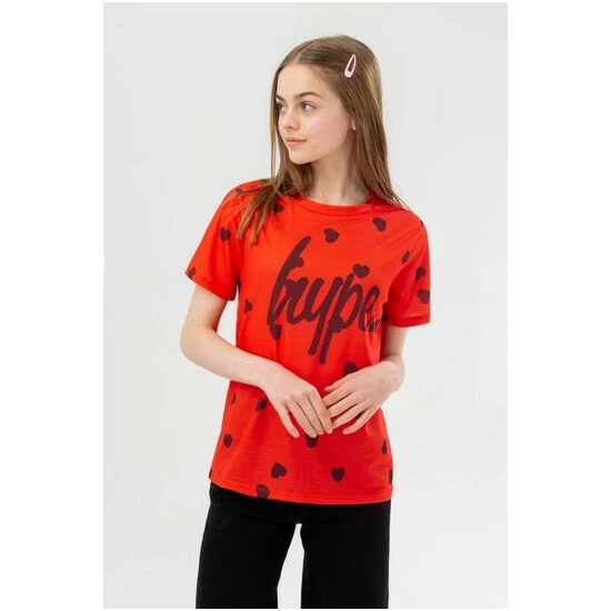 Make a statement in the Hype. Girls Red Heart Stamp Script T-Shirt. Designed in our standard kids tee shape with a soft touch 95% polyester, 5% elastane fabric blend in red for the ultimate comfort. Boasting an all-over mini heart print.