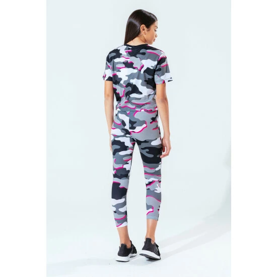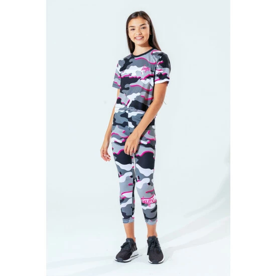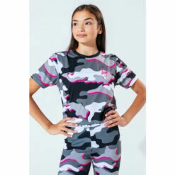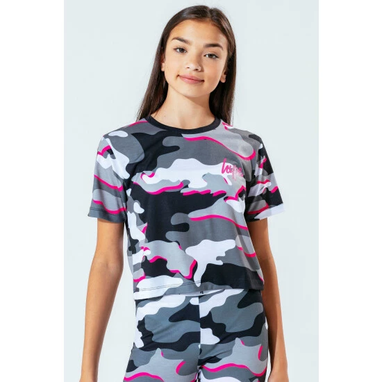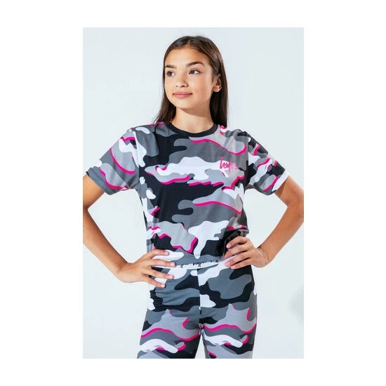 The Hype. pink line camo girls crop T-shirt features our signature camo print in a monochrome, grey and pink injection colour palette. In a 95% polyester and 5% cotton fabric base for supreme comfort in Hype. s standard crop T-shirt shape, highlighting a crew neck line and short sleeves. Finished with the iconic Hype. script logo in a holographic fabric. Wear with cycle shorts for an on-trend look.
