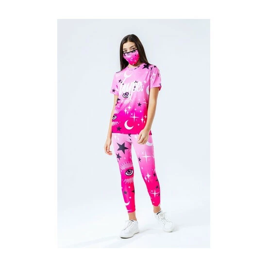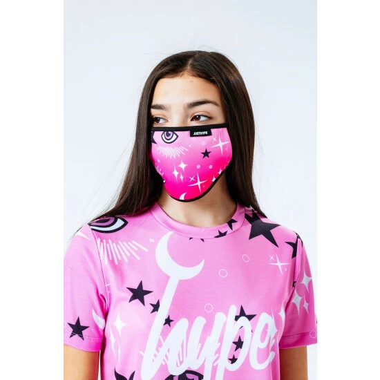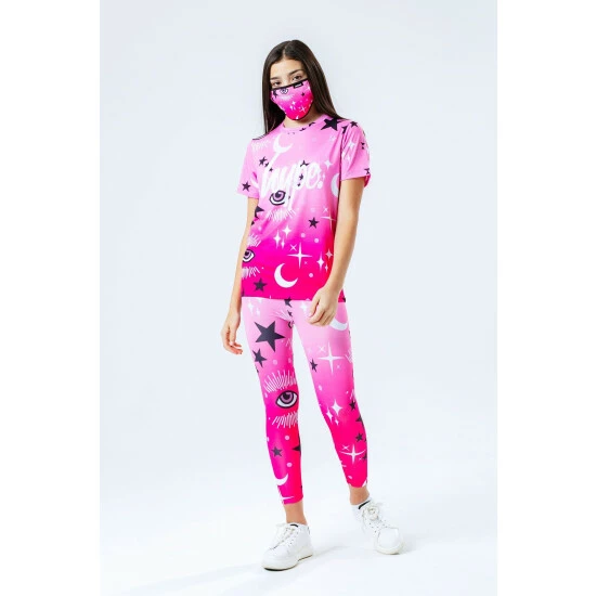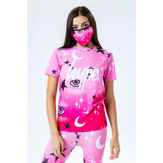 The easiest outfit you’ll ever have to put together. The HYPE. pink mystic leggings, tee and face mask kids set features an outfit that can be mix and matched with your seasonal ‘drobe. The tee is designed in Hype. s standard unisex T-shirt shape, with a crew neckline and short sleeves, designed in a pink soft-touch fabric base for supreme comfort, finished with the iconic HYPE. script logo in a contrasting white. The legging design features a monochrome embossed elasticated waistband, with an all-over moon and stars print in a pink, black and white colour palette. The hair scrunchie matches the print on the leggings and T-shirt to create a cute set. Wear with a cropped denim jacket and a pair of sliders for the ultimate casual relaxed look.