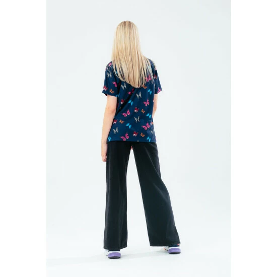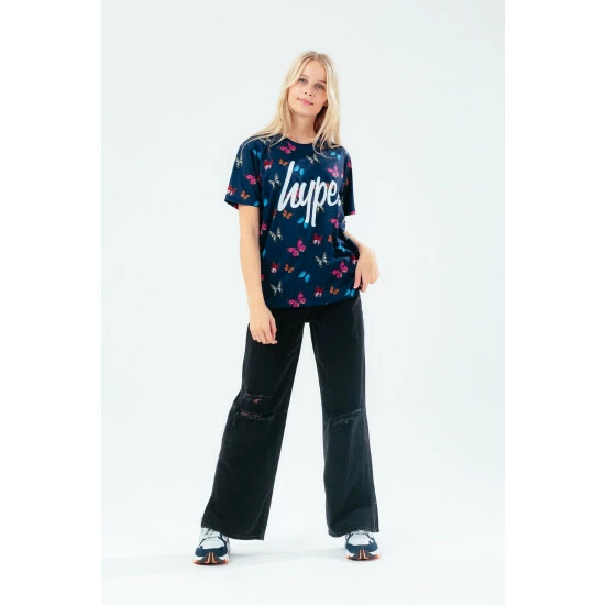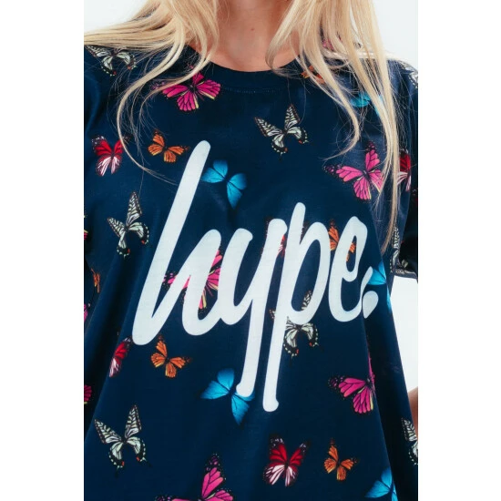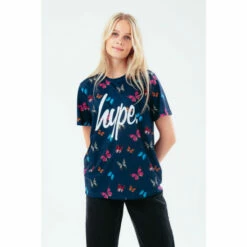 Add a touch of prettiness to their sporty casualwear with this lovely butterfly print t-shirt designed on a navy cotton base. Features the iconic Hype. script logo to the front.
