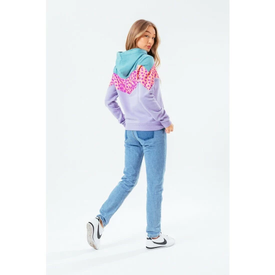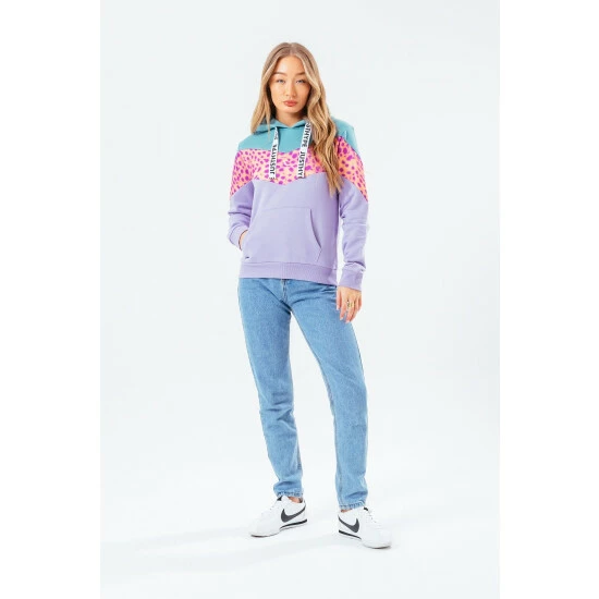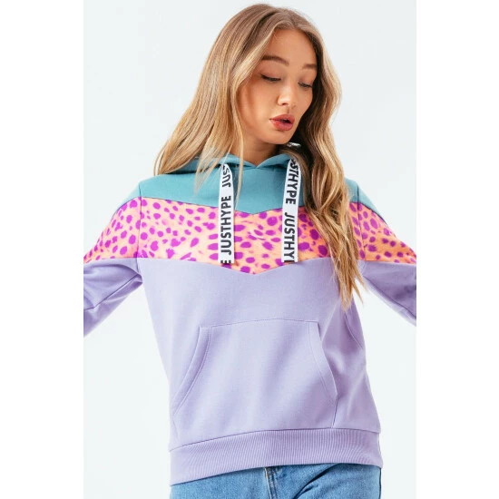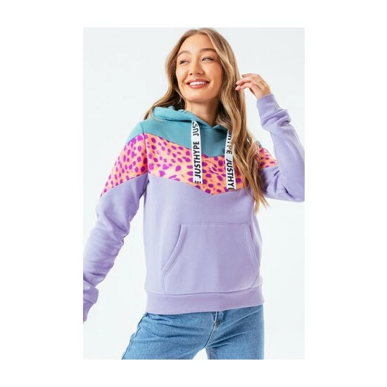 The Hype. Cheetah Drawstring Women’s Hoodie features a soft-touch fabric for the supreme amount of comfort. Highlighting fitted hem and cuffs, elasticated waistband and kangaroo pocket. The design features monochrome embossed drawstring pullers in an 80% cotton and 20% polyester fabric base for ultimate comfort. Finished with V panel colour blocking in an essential mint, cheetah inspired print in a purple and beige colour palette, and a tonal purple panel. Wear with drawstring joggers to complete the loungewear look. Machine washable.