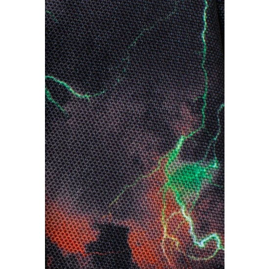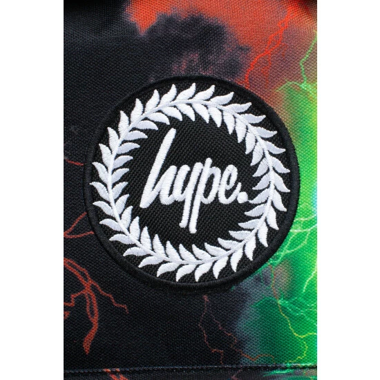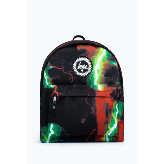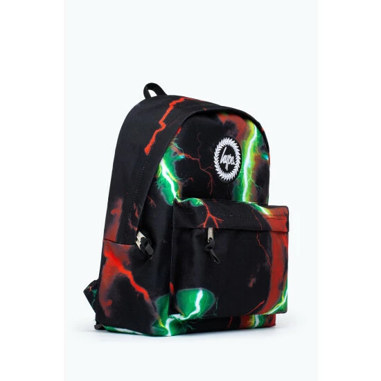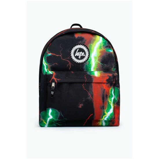 The HYPE. Unisex Black Anger Skies Crest Backpack is designed in our standard backpack shape in an all-over black anger skies green and red lightning print. Made from 100% polyester and finished with embroidered HYPE. crest branding in black, a front pocket, and an elasticated cord zip puller. Boasting a black grab handle and straps that offer supreme comfort with just the right amount of padding. Wipe clean only.