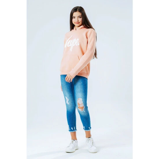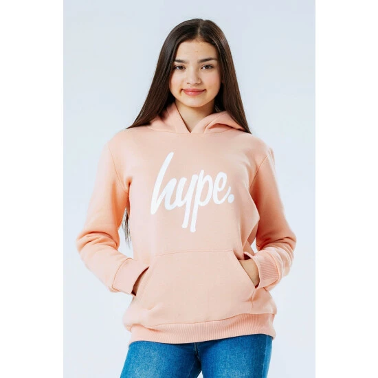 The HYPE. Pink Script Kids’ Pullover Hoodie is your perfect go-to look. In a pink 80% cotton and 20% polyester fabric base, with the iconic HYPE. script logo across the front in a contrasting white. Finished with a fixed hood, kangaroo pocket and fitted hem and cuffs.