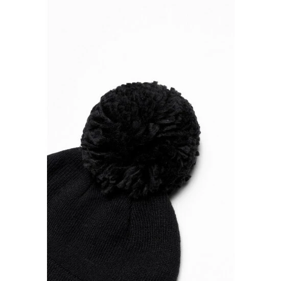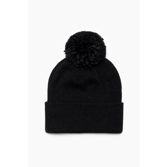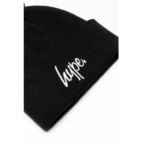 Wrap up in style with the HYPE. unisex black bobble script hat. Designed in a soft-touch acrylic fabric in black in our standard turned-up cuff design. Finished with a black pom pom top and the HYPE. script logo in white.