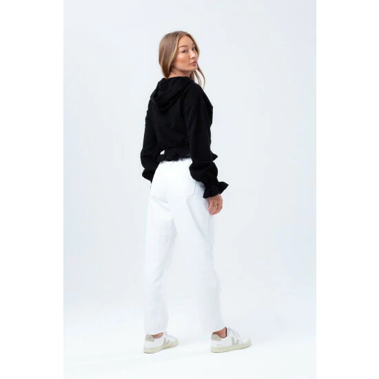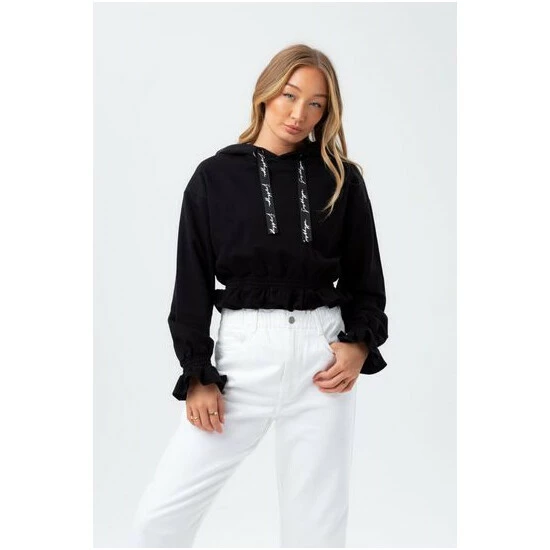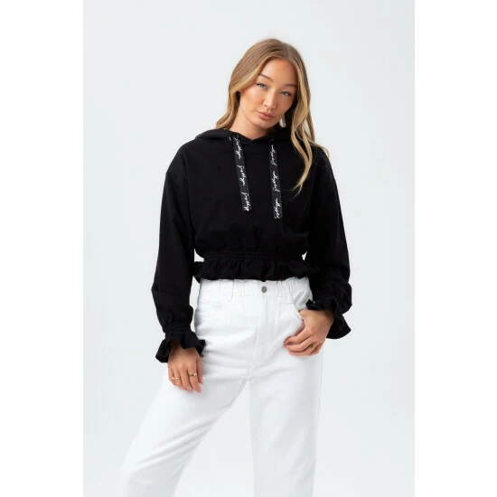 Introducing the HYPE. women’s black gathered hem JustHype drawcord hoodie. Designed in a soft-touch 65% cotton 35% polyester black fabric blend for the ultimate amount of comfort. Featuring a gathered hem and cuffs, fixed hood, and black branded drawstrings boasting the JustHype scribble logo in contrasting white. Wear with the matching T-shirt and joggers for an off-duty vibe.