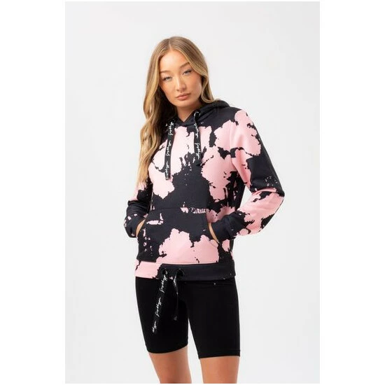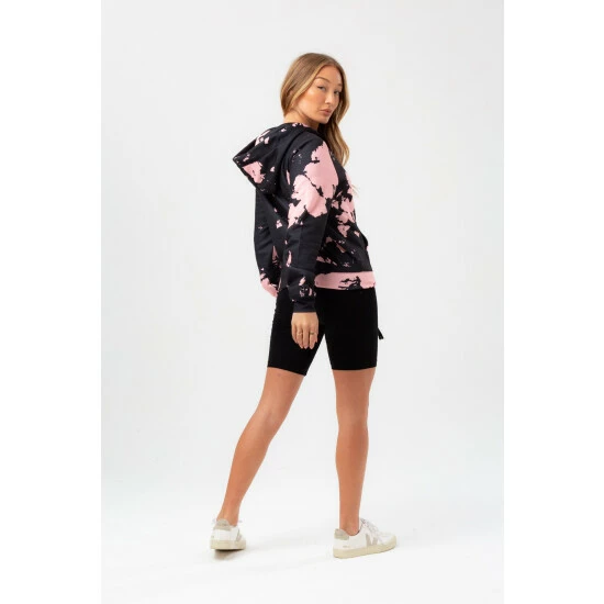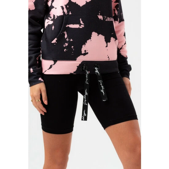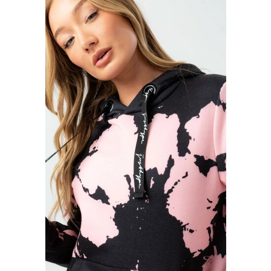 Introducing the HYPE. women’s black pink tie dye JustHype drawcord hoodie. Designed in a soft-touch 100% polyester fabric base in our standard drawcord hoodie shape. Featuring an all-over black pink tie dye sublimated print, fitted hem and cuffs, kangaroo pocket, fixed hood, and black branded drawcords on the hood and hem. Wear it with your favourite T-shirt and joggers for an off-duty vibe.