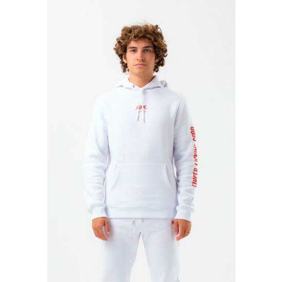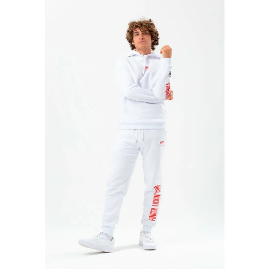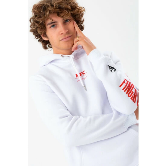 The Hype. X KFC White Finger Lickin’ Good. Hoodie is designed in a soft touch 65% cotton 35% polyester white fabric blend for the ultimate amount of comfort. Featuring the iconic “it’s finger lickin’ good” slogan in bold red print on the arm and finished with drawstring pullers, a kangaroo pocket, fitted hem and cuffs, and the Hype. X KFC lockup logo in red.
