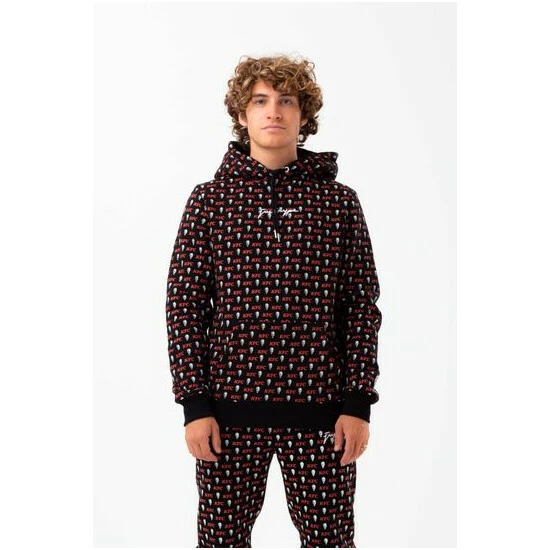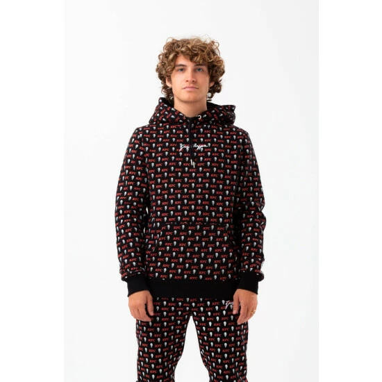 The Hype. x KFC black logo hoodie is designed in a 65% cotton 35% polyester black fabric blend for the ultimate amount of comfort. Featuring an all-over KFC repeat print and finished with drawstring black pullers with branded metal aglets, a kangaroo pocket, fitted hem and cuffs, and the embroidered justhype scribble logo. Wear with T-shirt and joggers to complete the look.