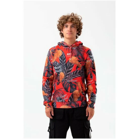 The Hype. x KFC red palm print hoodie is designed in a soft touch 100% polyester red fabric base for the ultimate amount of comfort. Featuring an all-over print boasting palm leaves, crispy chicken drumsticks, and the iconic it’s finger lickin good slogan. Finished with drawstring pullers, a kangaroo pocket, fitted hem and cuffs, and the Hype. x KFC lockup logo in contrasting white. Wear with T-shirt and shorts to complete the look.