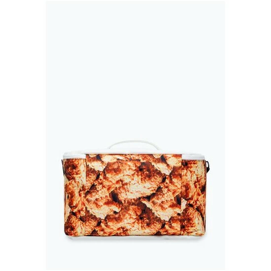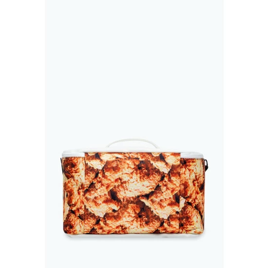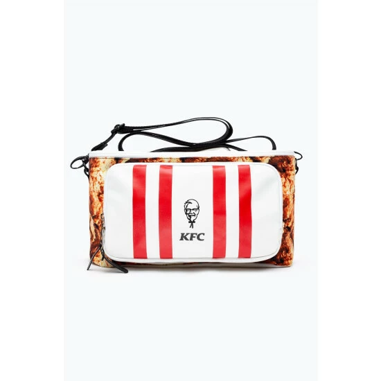 The HYPE. X KFC Original Recipe Variety Bag is designed in a cooler bag shape, complete with an inner lining, grab handle, and detachable justhype branded black strap. Made from 40% polyester 40% PVC 20% PU with a 11.5L capacity. Designed in an original recipe print with a white zip lid and KFC branded front pocket. Wipe clean only.