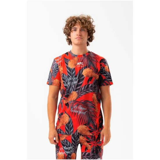 The Hype. x KFC red palm print T-shirt is designed in a 95% polyester 5% elastane red fabric blend for a supreme amount of comfort. Featuring an all-over print boasting palm leaves, crispy chicken drumsticks, and the iconic its finger lickin good slogan. Finished with a crew neckline, short sleeves, and the Hype. x KFC lockup logo in contrasting white. Wear with hoodie and shorts to complete the look.