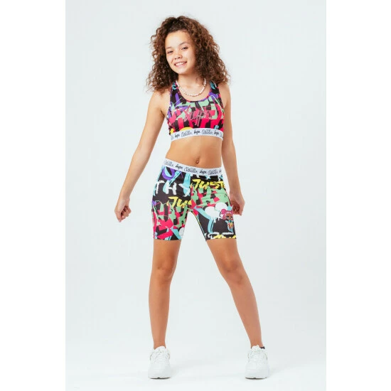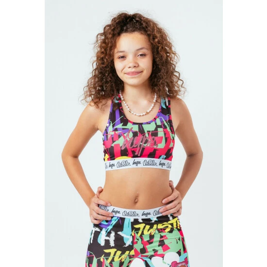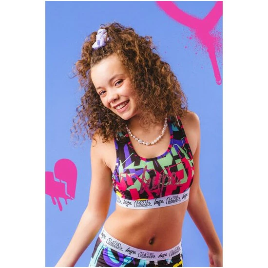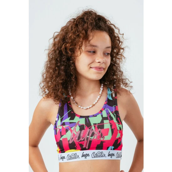 Brighten up your look with the L.O.L. Surprise x HYPE. V.R.Q.T Kids Bralette. Featuring a micro poly fabric for the ultimate comfort. With an all-over graffiti inspired print in a yellow, green, cyan and pink colour palette. Finished with a monochrome embossed woven elasticated waistband. Wear with a pair of black joggers and oversized denim jacket for an off-duty casual look.